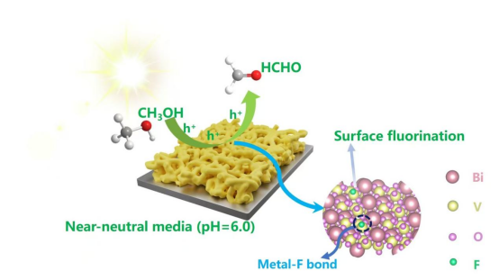 甲醛作为甲醇的关键下游产品,是重要的化工原料,广泛应用于纺织、化工及医疗等领域。利用光电催化技术将甲醇转化为甲醛,能够克服传统热催化法存在的高能耗与催化剂成本较高等问题,实现甲醇向甲醛的绿色转化。本研究采用表面氟化策略对BiVO4光阳极进行改性。在近中性电解液中,所制备的氟化BiVO4光阳极在甲醇氧化制备甲醛的反应中,表现出显著提升的选择性与产率。由于氟离子具有较强电负性,其取代BiVO4光阳极中的氧离子后,有效调控了材料表面电子结构,进而促进甲醇高效转化为甲醛。该研究揭示了近中性条件下BiVO4光阳极中金属–F键促进甲醇转化甲醛的反应机制,也为其他生物质平台分子的高效转化提供了理论参考。