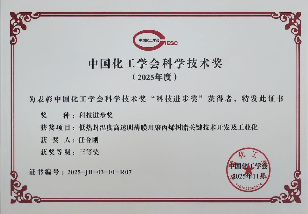 近日,2025年度中国化工学会科学技术奖颁奖仪式在北京隆重举行。材料科学与工程学院任合刚高级工程师参与完成的"低热封温度高透明薄膜用聚丙烯树脂关键技术开发及工业化"项目荣获科技进步奖三等奖。中国化工学会理事长戴厚良等学会领导出席颁奖仪式并向获奖代表颁发荣誉证书,中国化工学会副秘书长胡杰宣读了授奖决定。