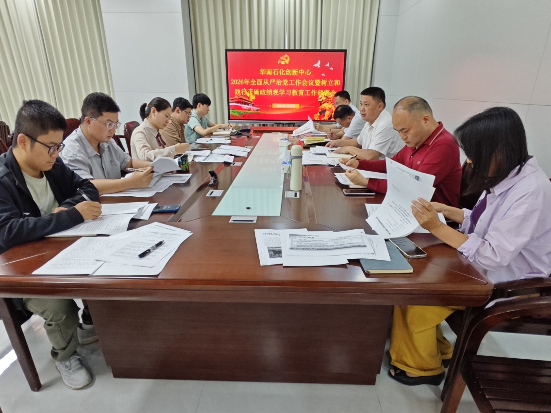 3月30日,华南石化创新中心召开2026年全面从严治党工作会议暨树立和践行正确政绩观学习教育会议。会议深入学习贯彻习近平总书记在二十届中央纪委五次全会上的重要讲话和全会精神,贯彻落实十三届省纪委五次全会精神和全国、全省2026年教育系统全面从严治党工作视频会议部署要求及全省教育系统警示教育大会精神,传达学习学校2026年全面从严治党工作会议暨树立和践行正确政绩观学习教育读书班开班式会议精神。中心党总支书记吴英柱主持会议,中心领导班子成员、党总支委员、党支部书记和相关干部职工参加会议。