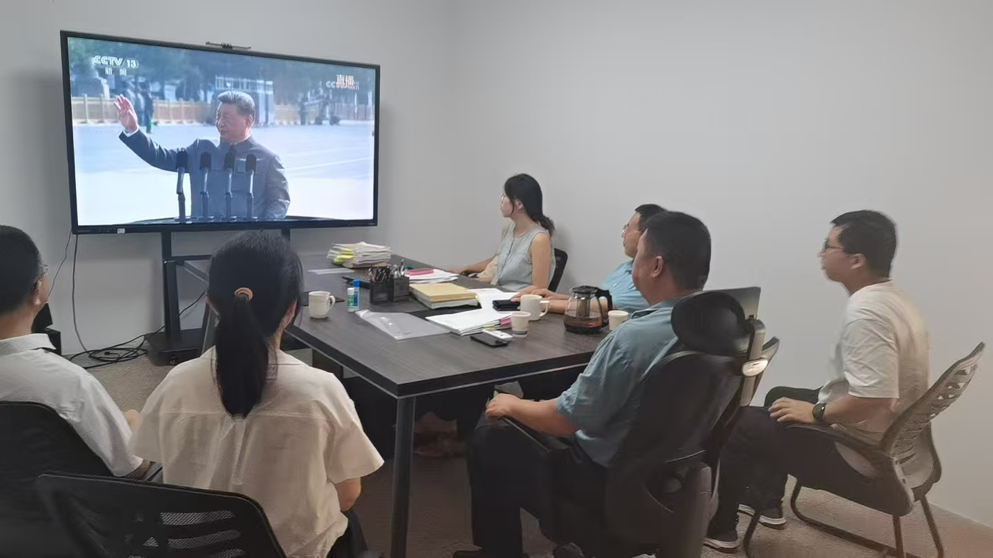 9月3日上午,纪念中国人民抗日战争暨世界反法西斯战争胜利80周年大会在京隆重举行,天安门广场举行盛大阅兵仪式,习近平发表重要讲话并检阅受阅部队,华南石化创新中心集体观看大会直播,共同见证这一庄严时刻,感受大国崛起的磅礴力量。