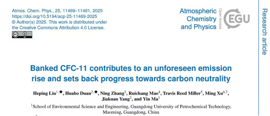 论文详细信息:Heping Liu, Huabo Duan, Ning Zhang, Ruichang Mao, Travis Reed Miller, Ming Xu, Jiakuan Yang, and Yin Ma. Banked CFC-11 contributes to an unforeseen emission rise and sets back progress towards carbon neutrality. Atmospheric Chemistry and Physics, 25, 11469–11481, 2025.