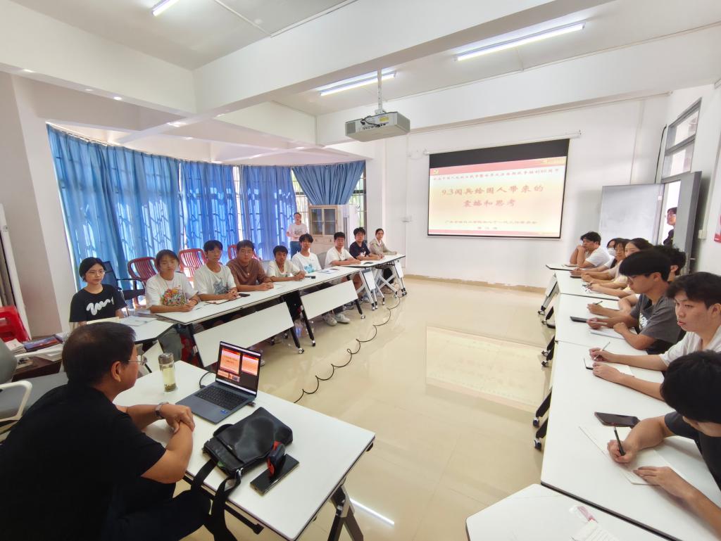 童汉清以《9.3阅兵给国人带来的震撼和思考》为题,围绕“中国人民抗日战争时间节点”、“抗战胜利纪念日”、“九三阅兵的亮点与意义”、“新时代青年的使命担当”四个方面展开。童教授紧扣时代脉搏,紧贴学生成长需求,结合“九·一八”事变历史背景,现场吟唱《松花江上》,并以杨靖宇、赵一曼等英烈事迹与淞沪会战、台儿庄战役等史实,阐释中国抗战东方主战场的战略地位,揭示“能战方能止战”的国防逻辑,为师生呈现一堂生动的思政大课。