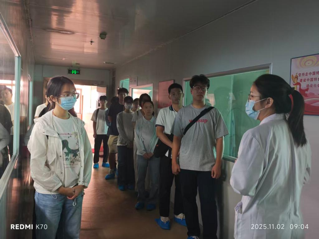 在血站工作人员的引导下,同学们参观了登记窗口与信息录入区、检测实验室。通过透明展示柜中的一次性采血袋、抗凝剂试剂等实物,直观了解血液采集的安全规范,结合动态演示屏,观察血液成分分离的全过程。血站公益讲解员以真实案例为引,详细讲解从健康筛查、血液检测到合格储存的标准化流程,并针对"献血安全保障"、"献血后护理方法"等问题进行专业解答。