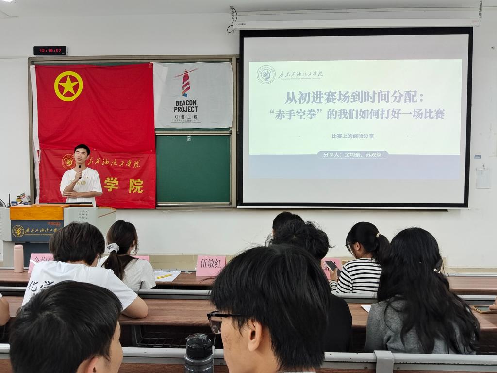 经验分享环节,五位优秀学子倾囊相授:国家奖学金获得者吴旭辉分享学习、竞赛与学生工作的平衡之道;24级专业第一的徐舒文同学详解专业课高效学习方法;英语学习达人黄丽君传授实用备考与提升技巧;余均豪、苏观岚同学结合创新创业、挑战杯等赛事,分享备赛策略与团队协作心得。分享内容务实鲜活,充分展现化院学子扎实的学业素养与蓬勃的青春朝气。