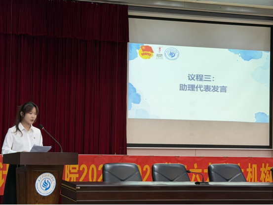 青年志愿者协会行动部冯新淇作为新生助理代表发言。她分享了自己对“助理”作为老师指令的接收者、部门工作的协助者、同学需求的倾听者这3种角色的理解,并表态将发挥好学生干部职责、以空杯心态学习、主动改进不足,以高标准践行职责,用行动传递温暖。