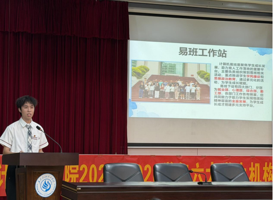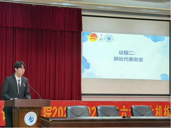 学生会权益发展部陈思博作为部长代表发言。他回顾了从部门助理成长为部长的历程,分享工作统筹、沟通能力提升及平衡学业与工作的收获。