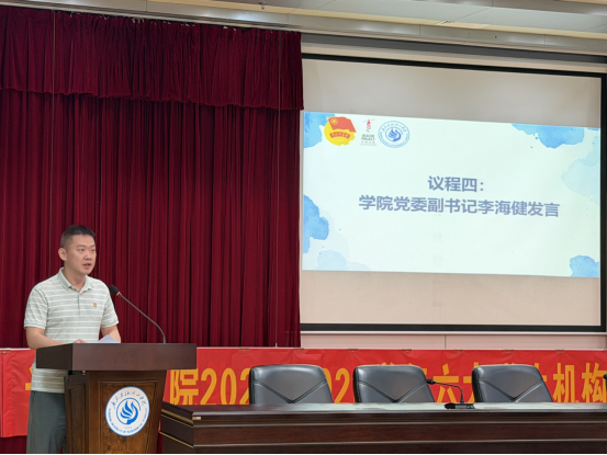 李海健对本次大会进行总结发言。他高度评价了各机构工作规划细致且务实,充分肯定学生机构在学院工作上的突出贡献。他强调学生干部是学生当中的骨干力量,是师生沟通的桥梁,其工作成效与素质高低关乎学院高质量发展。针对学生干部的成长,他明确学生干部要在学风班风校风建设中做好模范带头;明确职责、团结协作;发挥各项活动中的组织、领导作用;在日常管理中起桥梁纽带作用;在思想教育中发挥助手作用等五个方面发挥作用和具备活力、动力、合力、能力、魄力等五种素养。