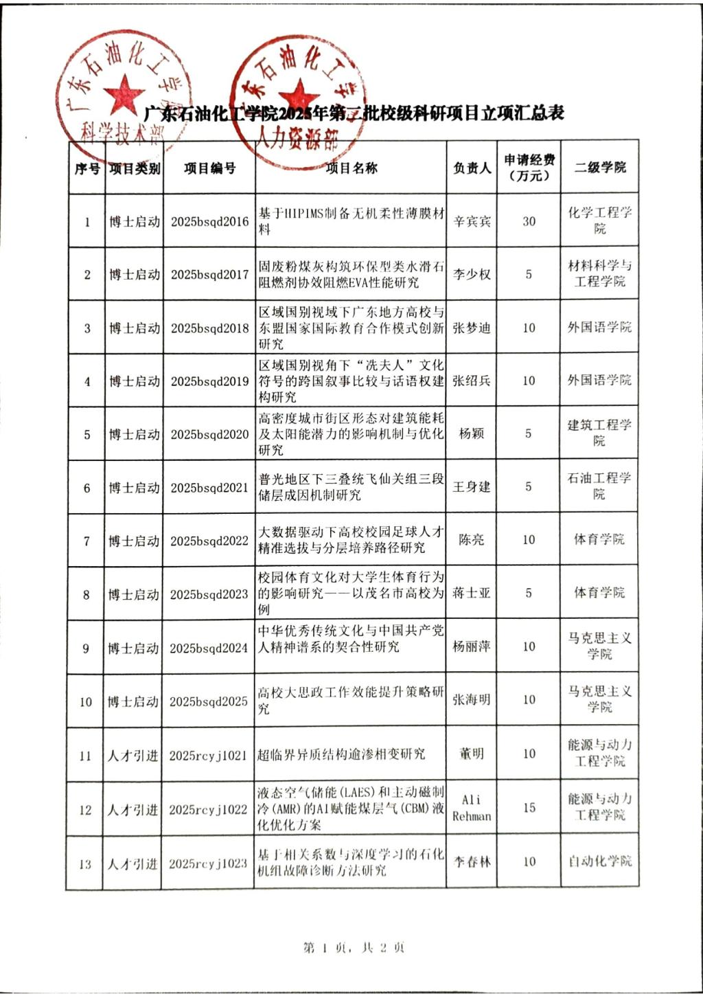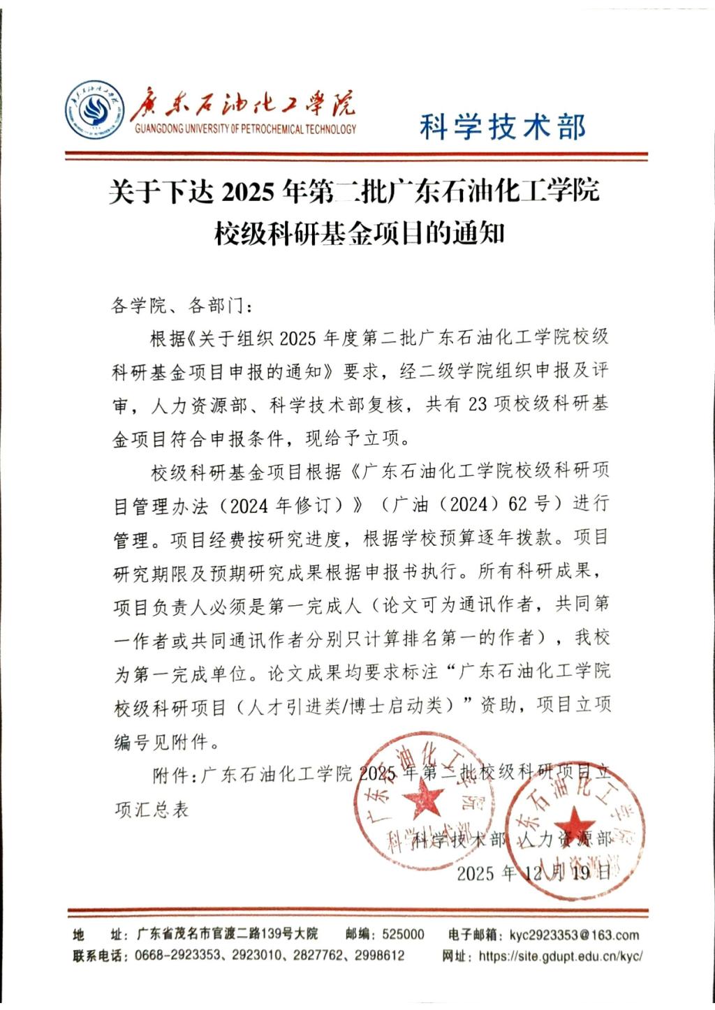 关于下达2025年第二批广东石油化工学院校级科研基金项目的通知