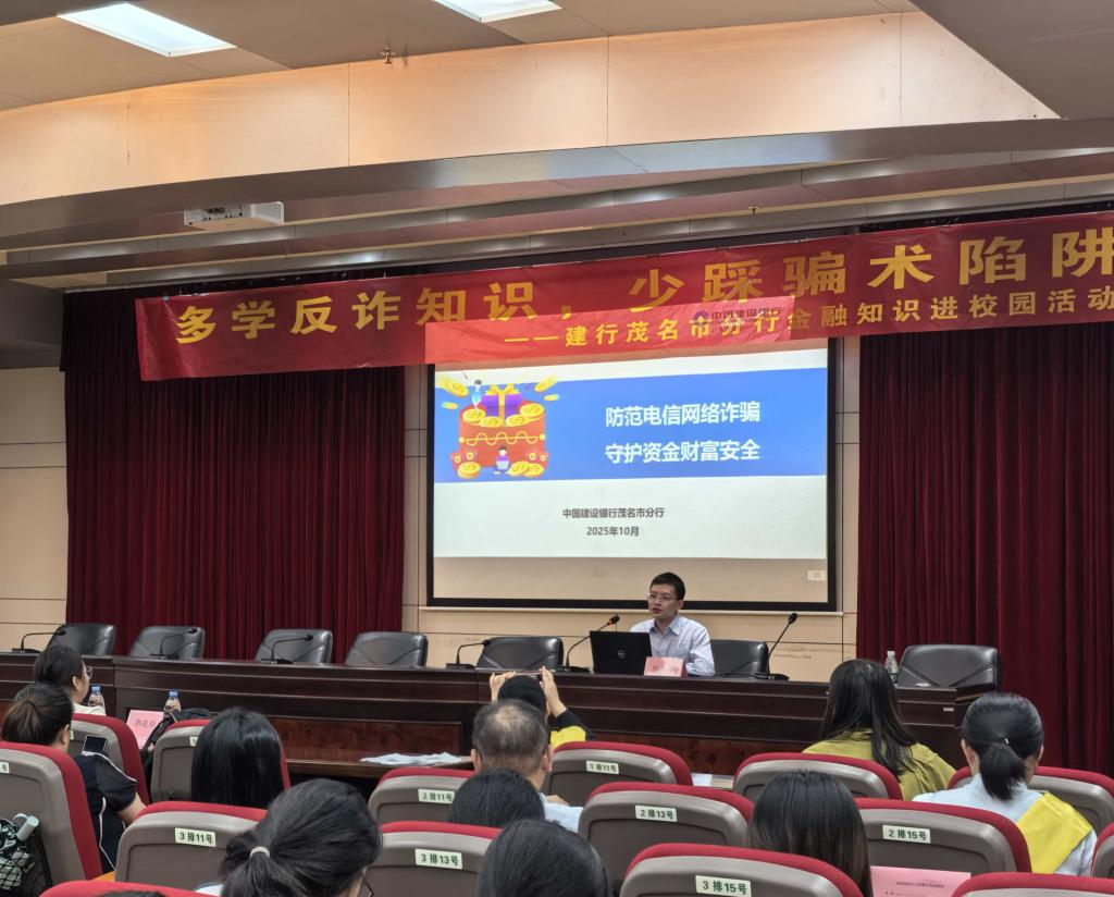 活动第二项议程聚焦电信网络诈骗防范,建设银行茂名石油支行彭木海副行长以《金融知识进校园—— 防范电信网络诈骗,守护资金财产安全》为主题分享实战经验。彭木海副行长结合近年来高发的校园诈骗案件,重点剖析“刷单诈骗”等典型案例,详细讲解了诈骗分子针对学生群体的典型作案手法,并现场传授了实用的防范技巧与应对策略。在深入浅出的讲解中,现场气氛活跃,同学们纷纷表示受益匪浅,有效提升了识别陷阱、保护财产安全的能力,将“守护钱袋子”的意识内化于心。符清桓副书记在该环节补充强调,希望大家牢记“不轻信,不透露,不转账”的九字真言。