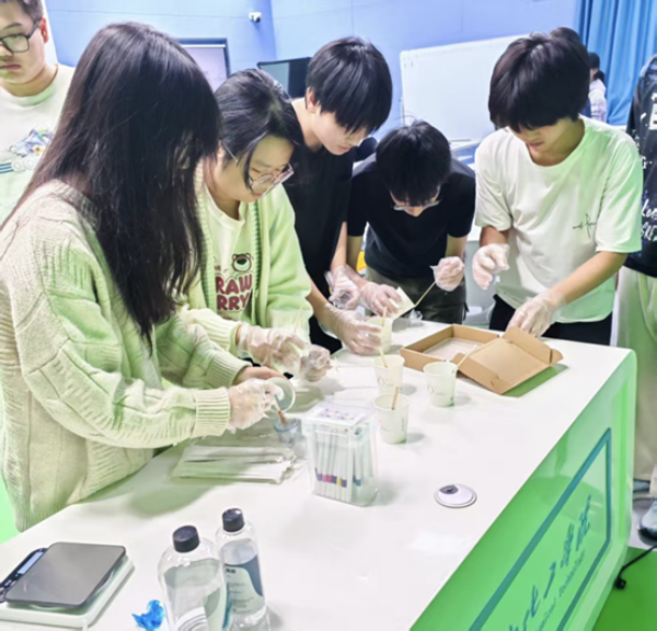 最令人期待的时空胶囊制作环节,同学们精心挑选干花、闪粉等小饰品,放入模具中倒入环氧树脂胶体,制作独一无二的“时光琥珀”。同时,大家认真书写给一年后自己的信函,记录当下的困惑、目标与初心。这些装满记忆的胶囊将被封存,等待未来的自己开启。
