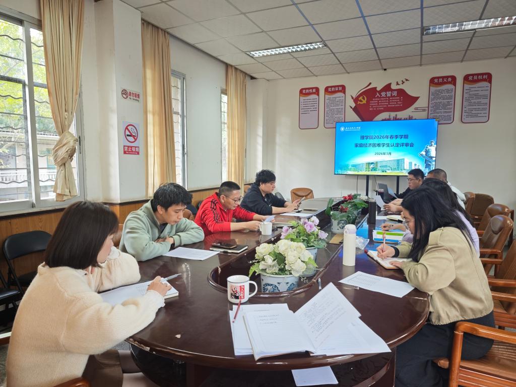 会上,首先进行2026 年春季学期理学院家庭经济困难学生认定评审。与会人员严格按照认定标准,公平、公正、公开完成资格审核,审议通过 11 名学生家庭经济困难认定申请,确保资助政策精准落地。