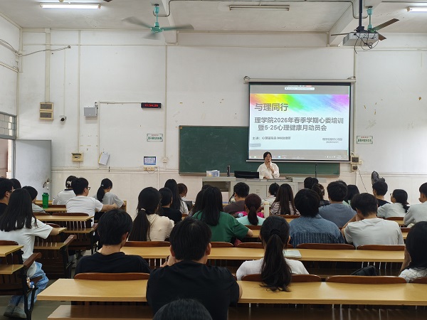 2026年4月1日,理学院在二教B307教室召开2026年春季学期心理委员培训暨5·25心理健康月动员会。心理辅导员钟书文主讲,全体班级心理委员参会,凝聚心理育人合力,筑牢学生心理健康防线。