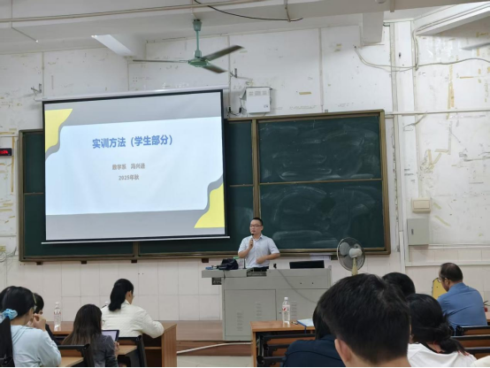 紧接着,数学系冯兴进老师围绕“规范实训的方法”主题,为同学们传授实训方法与技巧。他从规范备课、如何确定教学目标、如何进行教学过程设计等关键维度展开讲解,着重强调教学过程中要聚焦“四基四能” 培育,紧扣新课程标准开展,帮助同学们快速掌握教学实践的核心要点。