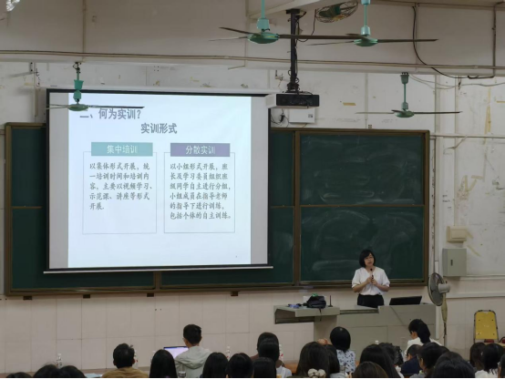 随后,伍思敏主任对实训工作提出三点明确要求。第一,全体同学需高度重视实训课程,认清其与教师资格认证、教育实习及未来教学工作的紧密关联,扎实练就讲台基本功;第二,实训过程中要积极拥抱教育创新,充分运用AI 技术与智慧教育平台赋能教学实践;第三,指导老师需严格落实实训指导责任,强化过程管理,对教学能力薄弱的同学进行精准帮扶,通过多听课、多指导、多反馈,确保每位同学都能达标完成实训任务。