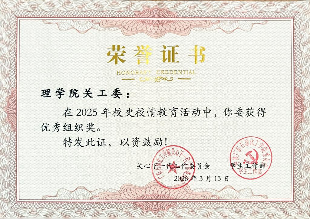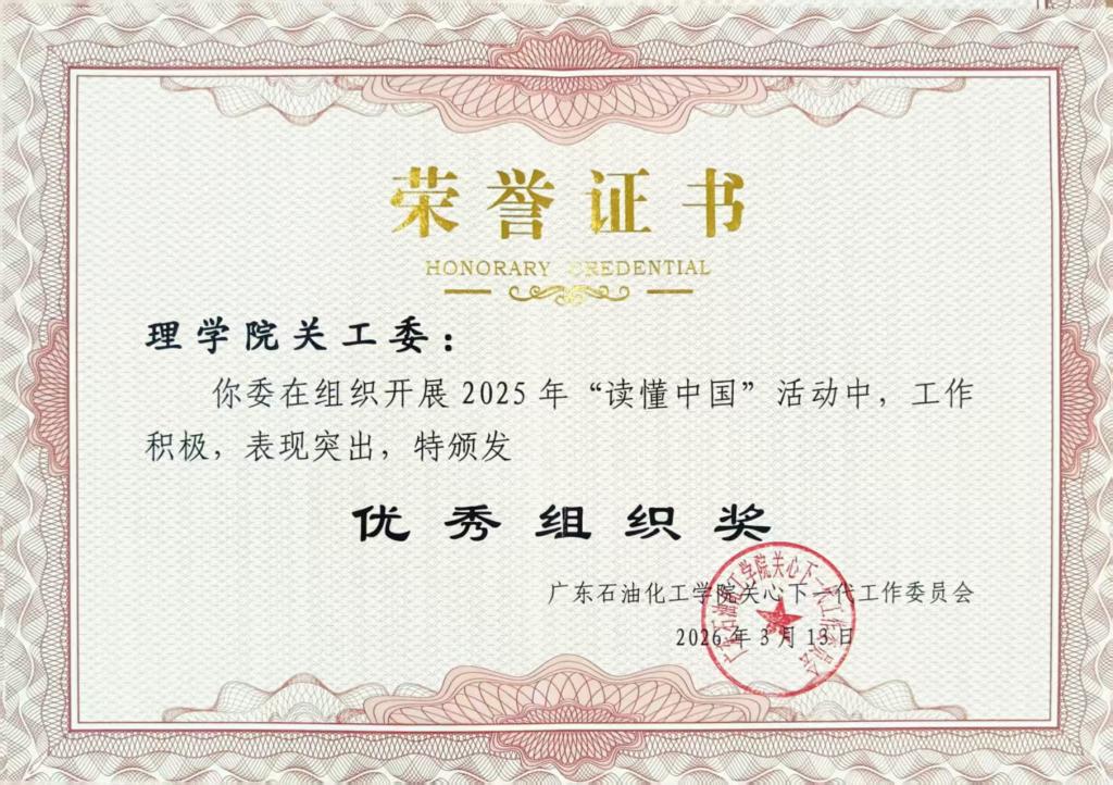 近日,广东石油化工学院关工委、学生工作部联合发布表彰决定,理学院关工委凭借扎实的组织工作与突出的育人成效,在 2025 年校史校情教育活动和 “读懂中国” 活动中双双荣获优秀组织奖,充分彰显了学院关工委在立德树人、培根铸魂工作中的责任与担当。