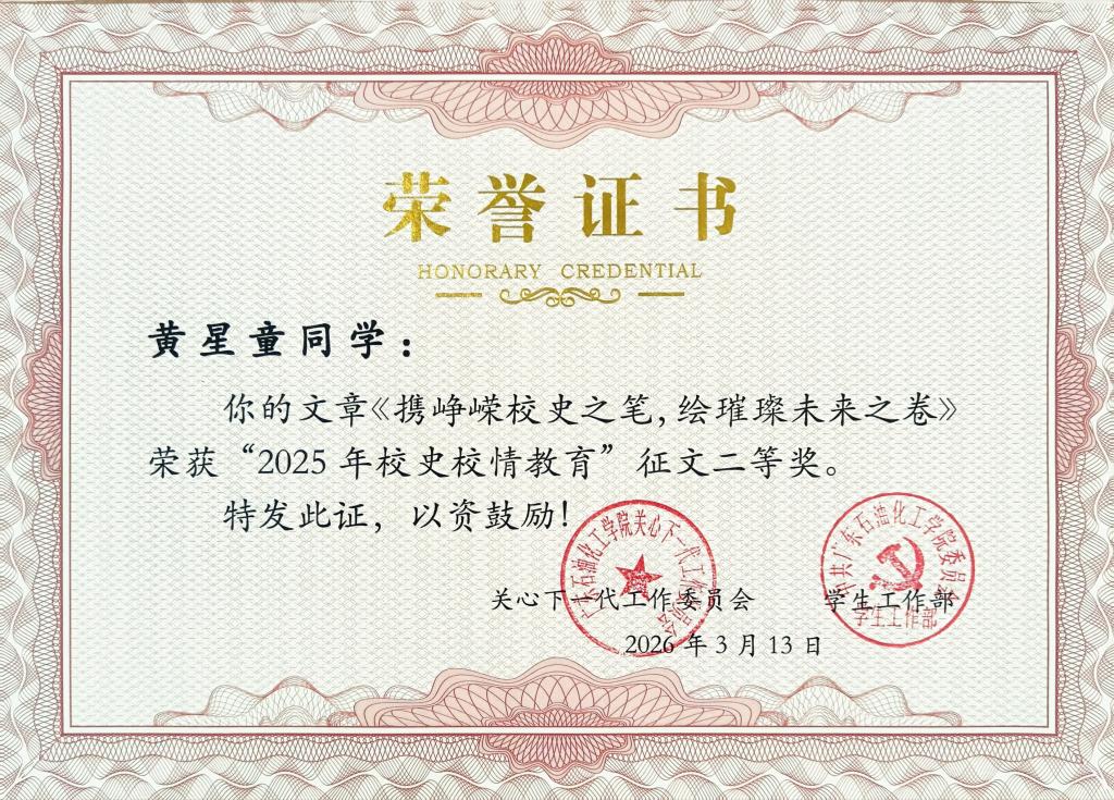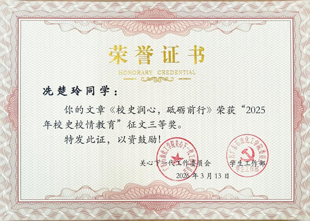 校史校情是高校最鲜活的育人教材。在 2025 年校史校情教育活动中,理学院关工委精心统筹、广泛动员,组织新生班级开展校史学习、心得撰写等系列活动,引导学生深入了解学校发展历程,厚植爱校荣校情怀。经学校评审,数师 25-1 班黄星童同学的作品荣获校史心得体会二等奖,数师 25-2 班冼楚玲同学的作品荣获校史心得体会三等奖,用青春笔触书写了对学校的深情与热爱,为学院争得荣誉。
