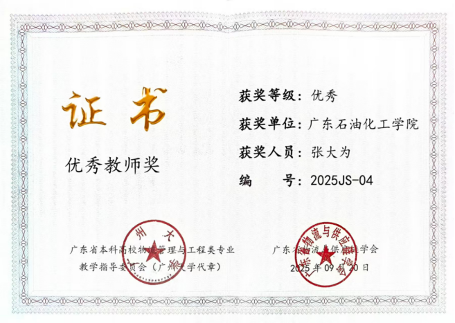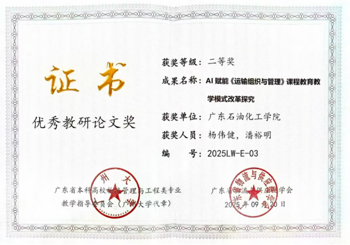 物流工程系主任张大为老师获评优秀教师称号;杨伟健、潘裕明老师撰写的教研论文《AI赋能〈运输组织与管理〉课程教育模式改革探究》获优秀教研论文二等奖。
