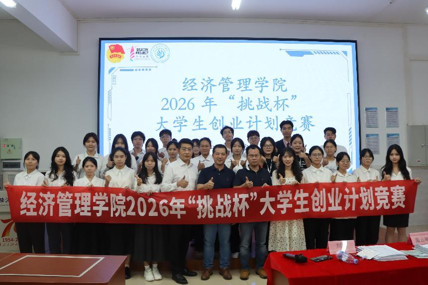 10月19日晚,经济管理学院于经管楼102教室成功举办2026年“挑战杯”大学生创业计划竞赛院赛。经济管理学院党委书记温云峰副教授、学院大学生创新创业实践中心主任刘伟副教授、学院团委负责人林衍君老师、会计07级校友企业家杨凯川师兄担任评委,近百名学生观赛。