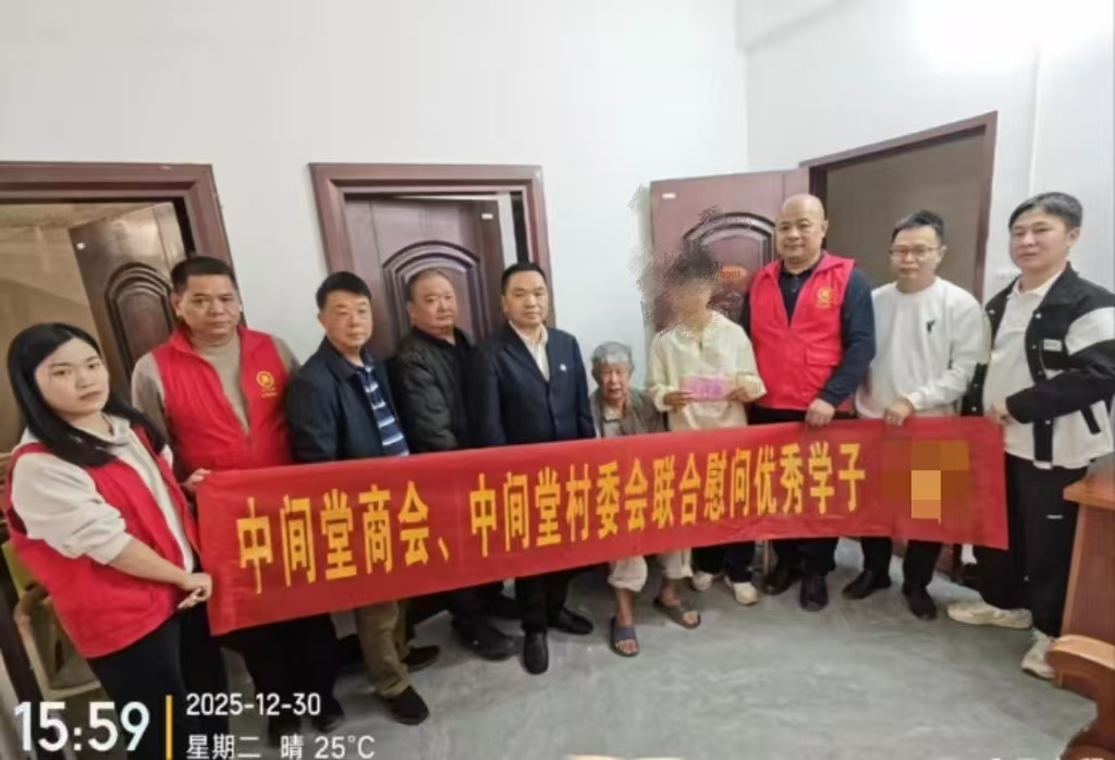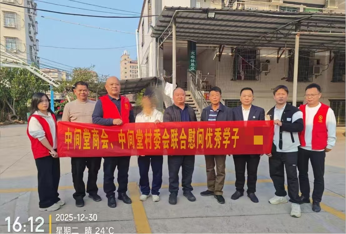 寒冬暖阳,温情暖心。在活动现场,中间堂村委会和中间堂商会将筹集的10300元慰问金、水果等生活慰问物资转赠给小苏同学,并向小苏同学及其父亲致以最深切的问候。