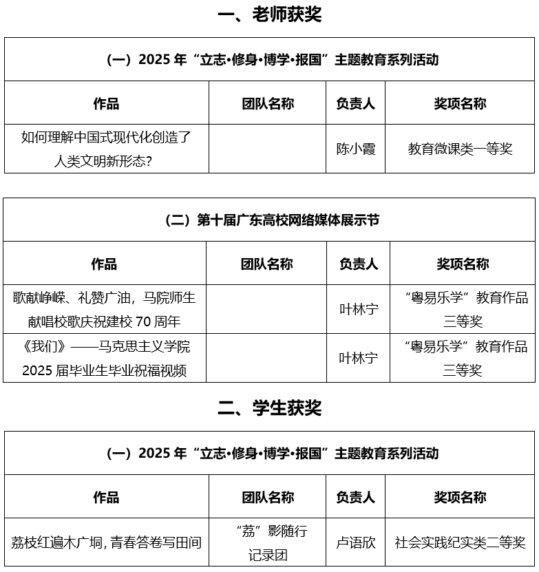 近日,广东石油化工学院2025年“育人+”大学生思想政治教育主题系列活动获奖名单正式公布。马克思主义学院师生凭借扎实的理论功底、创新的实践探索和饱满的青春热情,在各类活动中表现亮眼,共斩获42项荣誉,其中一等奖3项、二等奖12项、三等奖27项,充分彰显了我院思想政治教育的丰硕成果与育人实效。