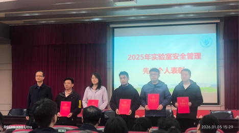 2026年1月5日,学校在图书馆学术报告一厅召开“2025年度实验室安全工作会议”,会议对年度实验室安全管理先进单位和先进个人进行了表彰。能源与动力工程学院获评“2025年度实验室安全管理工作先进单位”,熊碧波老师荣获“2025年度实验室安全管理先进个人”称号。能动学院党委书记陆晓清代表学院领奖。