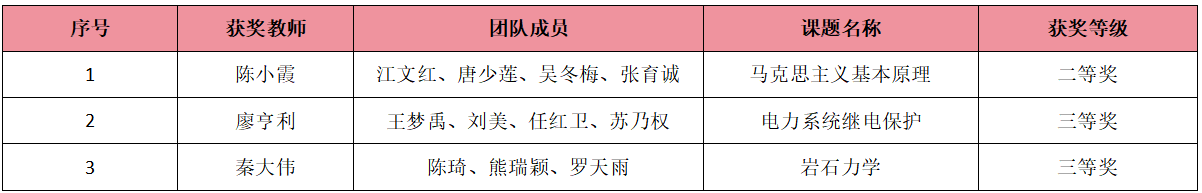 近日,“超星杯”第七届全国高校混合式教学设计创新大赛落下帷幕。学校共荣获3项大奖,马克思主义学院陈小霞团队(团队成员:江文红、唐少莲、吴冬梅、张育诚,主讲课程:《马克思主义基本原理》)获二等奖,自动化学院廖亨利团队(团队成员:王梦禹、刘美、任红卫、苏乃权,主讲课程:《电力系统继电保护》)及石油工程学院秦大伟团队(团队成员:陈琦、熊瑞颖、罗天雨,主讲课程:《岩石力学》)获三等奖。