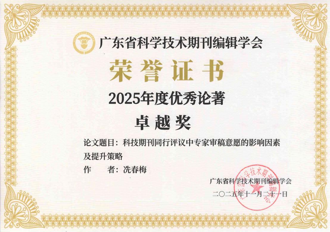 冼春梅撰写的论文荣获广东省科技期刊卓越论著奖