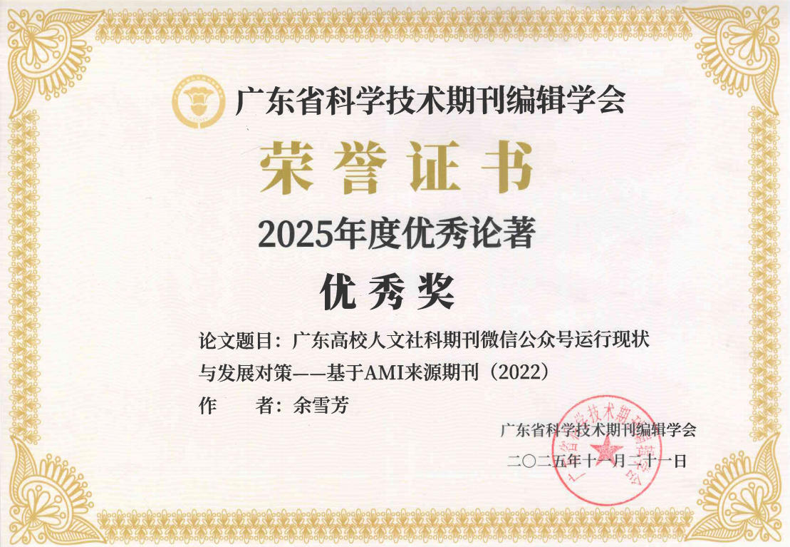 学校学报编辑部多名老师获奖,是学报编辑部注重人才培养、持续推进编辑队伍建设的重要成果。未来,学报编辑部将继续秉持创新、专业、严谨的工作理念,不断提升办刊质量与学术影响力,为学校“申博改大”、科研创新赋能,为广东省乃至全国期刊事业的高质量发展贡献力量。
