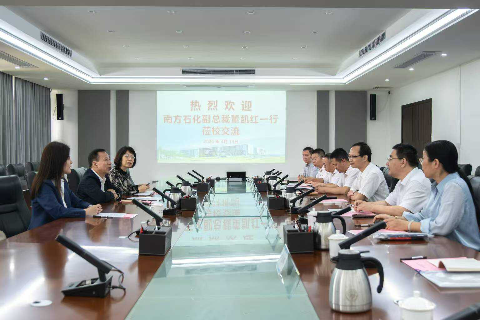 4月14日,南方石化集团有限公司副总裁董凯红、总裁办公室总监梁穗宁、人力资源部经理高小燕一行来校调研交流。学校校长梁浩出席座谈会,双方围绕石化类专业人才培养、校企合作、学生实习就业等议题展开深入探讨。学校党委常委、副校长孙国玺参加座谈。