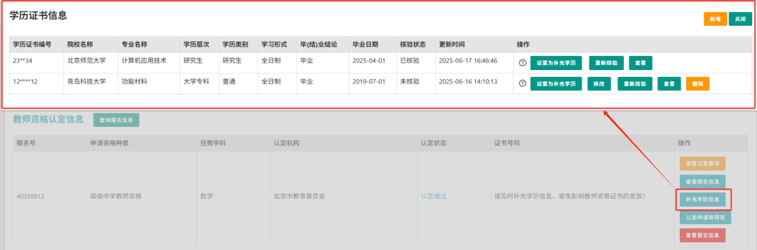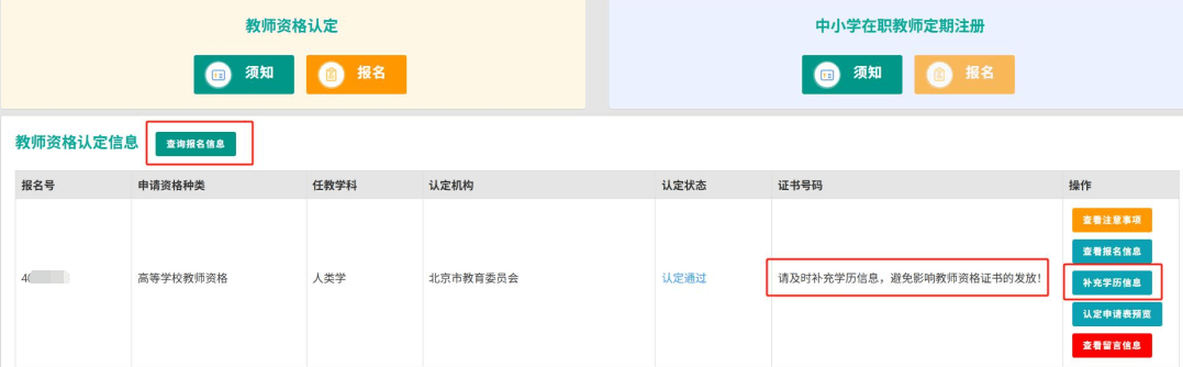 返回“查询报名信息”,找到已通过的认定记录。点击“补充学历信息”,选择已核验的学历并提交。