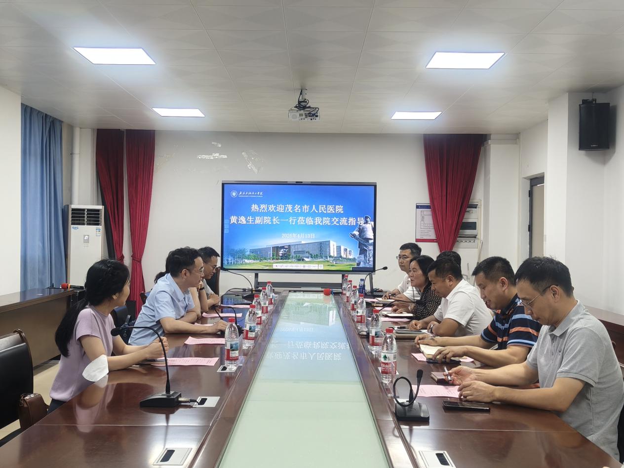 4月13日下午,茂名市人民医院黄逸生副院长一行五人来我院就研究生联合培养工作及开展学科建设、科研项目合作深入调研交流。学院院长王春、副院长马超、食品与营养硕士学位点专业带头人张强、生物工程系主任岳茂峰、生物工程系副主任沈超、化学学院教授李桂银参加座谈。会议由王春院长主持。