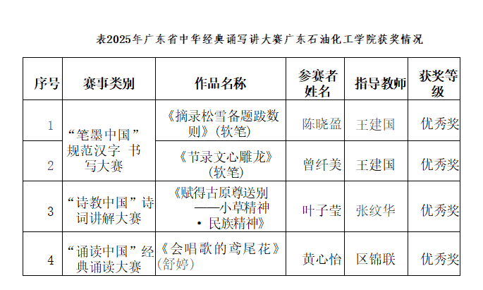 近日,广东省教育厅、广东省语言文字工作委员会发布了《广东省教育厅广东省语言文字工作委员会关于公布2025年广东省中华经典诵写讲大赛获奖名单的通知》(粤教办[2025]14号),我院共有4名学子在“笔墨中国”规范汉字书写大赛、“诗教中国”诗词讲解大赛及“诵读中国”经典诵读大赛三个参赛类别中喜获优秀奖。同时,学校在本年度广东省中华经典诵写讲大赛中荣获“优秀组织奖”,这是我校参加该比赛以来获奖最多的一次,表明我校在推进语言文字工作高质量发展中取得良好成效,后续将再接再厉,在该类赛事中再创佳绩。获奖名单详见下表