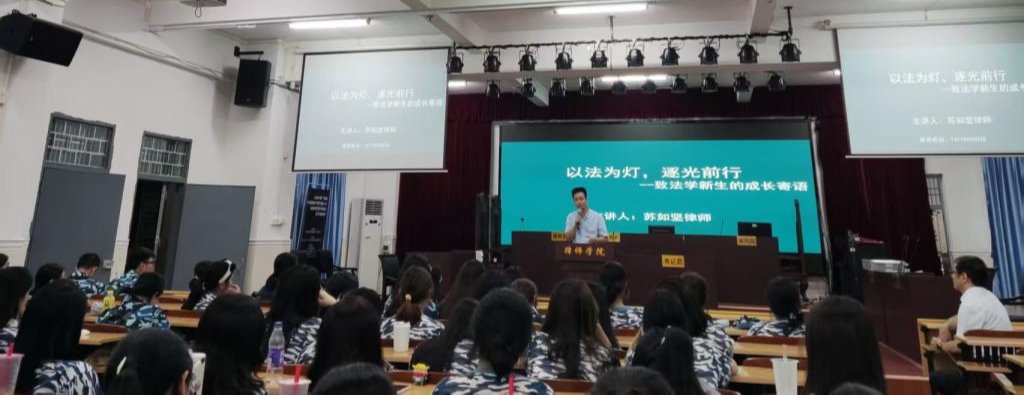 2025年9月21日晚,文法学院2025级法学专业新生教育见面会在二B501模拟法庭顺利举行。本次见面会由卢显洋副教授主持,文法学院院长马波教授出席并致辞。会议邀请广东南木律师事务所合伙人、2011级校友苏如坚,广东诚挚律师事务所优秀律师、2012级校友谢安凤律师分享经验,与新生展开专业学习与职业规划选择交流。