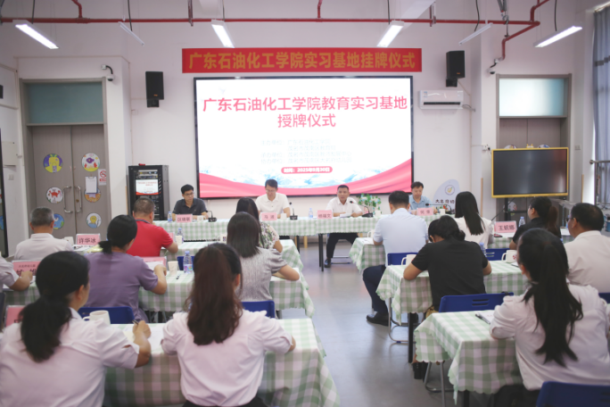 为扎实推进《广东石油化工学院茂南区人民政府“三所学校”质量提升专项合作协议》的落地实施,2025年9月30日上午,文法学院与茂南区教育局联合举办纵向帮扶茂南区“三所学校”质量提升暨五所幼儿园教育实习基地授牌仪式。文法学院院长马波、副院长区锦联、教育系负责人皮陆杨博士、崔斯敏博士、王妮娜博士以及茂南区教育局领导、茂南区羊角中心幼儿园、新坡中心幼儿园、大名府幼儿园、幸福幼儿园、实验幼儿园等相关负责人40余人出席会议。