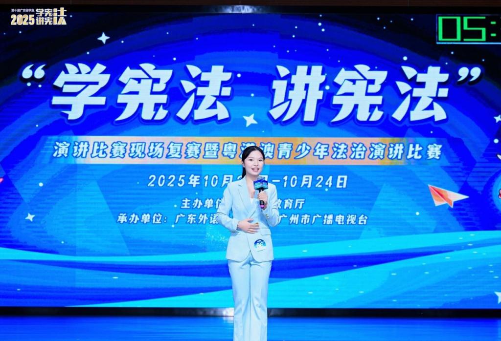 2025年10月23日至24日,由广东省教育厅主办的第十届广东省学生“学宪法讲宪法”活动现场复赛在广东外语外贸大学白云山校区隆重举行。文法学院2024级学生吴秀丹以优异表现斩获佳绩,荣获演讲比赛高校组二等奖。
