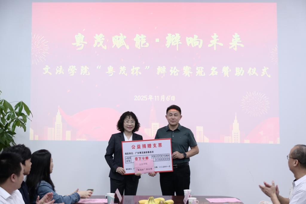 此次冠名赞助仪式的成功举办,不仅为“粤茂杯”辩论赛的顺利开展注入了强劲动力,也进一步拓宽了校企协同育人的路径,是文法学院推动实践教学、链接社会资源的一次生动实践。