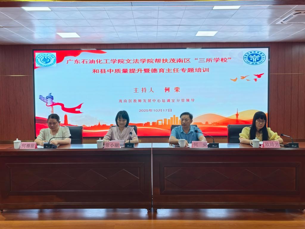 10月17日,文法学院联合茂南区教师发展中心,在该中心学术报告厅开展2025年纵向帮扶茂南区“三所学校”德育主任专题培训。学院党委副书记劳小丽、茂南区教育局德育股股长何雅丽出席开班仪式,茂南区教师发展中心培训室分管领导何荣主持开班仪式。全区各中小学政教正副主任、分管德育副校长等约160人参训。
