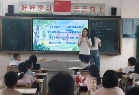 活动现场,法学专业学生以饱满的热情投入普法宣讲。在校园霸凌防治环节,同学们通过情景模拟、案例剖析,清晰界定校园欺凌的行为边界,教导孩子们遭遇欺凌时如何勇敢拒绝、及时求助;在未成年人权益保护板块,重点讲解家庭保护、学校保护的核心内容,明确侵害未成年人权益的违法情形,引导孩子们树立维权意识。针对交通安全,同学们结合乡村道路实际,讲解步行、乘车的安全规范,警示违规出行的法律后果;对于知识产权保护,则针对不同学段学生的认知特点,将复杂的商标政策条文转化为实用指南,通过浅显易懂的语言和生动有趣的图文,深入浅出地讲解了专利、商标的基础概念,并结合实际案例,详细阐述了如何在日常生活中运用商标知识辨别产品真伪;网络安全与反诈骗宣讲则聚焦未成年人沉迷网络、游戏充值诈骗、网络欺凌等问题,普及防范技巧,守护数字空间安全。
