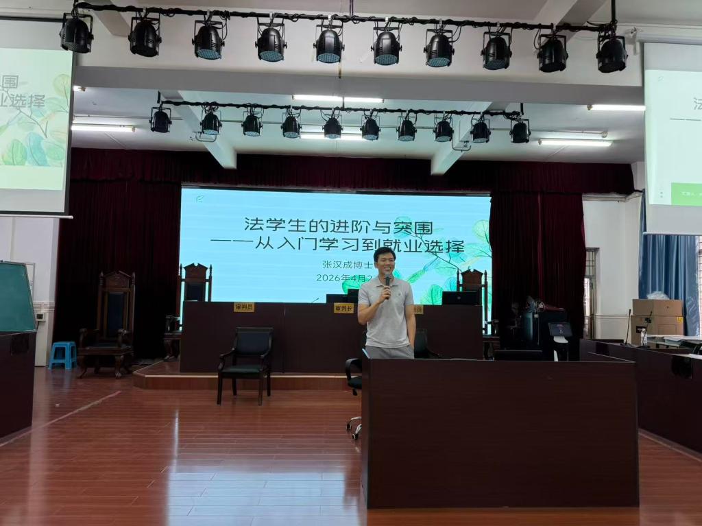 为加强法学新生专业思维培养,深化学生对就业领域的认知,提升专业认同感与学习积极性,4月23日下午,法律系在2B501课室举办了《法学生的进阶与突围:从入门学习到就业选择》学术讲座。本次讲座邀请广州医科大学卫生管理学院法学系讲师、西南政法大学民商法学博士张汉成老师主讲,面向2025级法律专业全体学生开展。讲座由法律系主任卢显洋主持,部分教师代表及120余名法学专业学生参加活动。