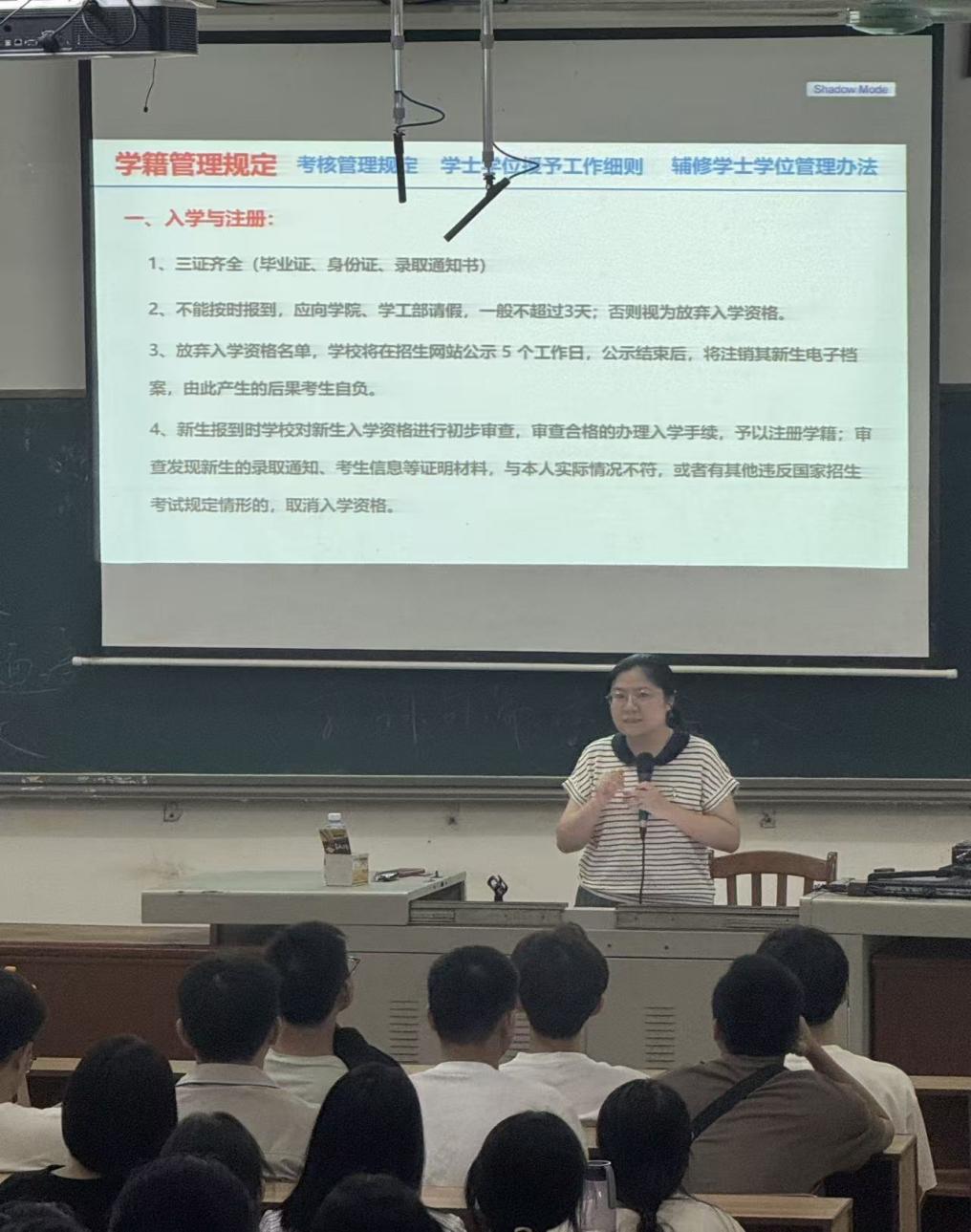 9月24日,学院党委副书记强静雨就学校学籍管理工作的相关政策进行解读,依次讲解了课程考核、转专业、休学与复学、毕业以及学业证书管理等内容,重点强调学术诚信要求、毕业论文标准、考风考纪等“红线条款”,让新生入学即明确“行为底线”。同时开展安全教育,介绍校园安全知识、防诈反诈知识等内容,筑牢校园安全防线。