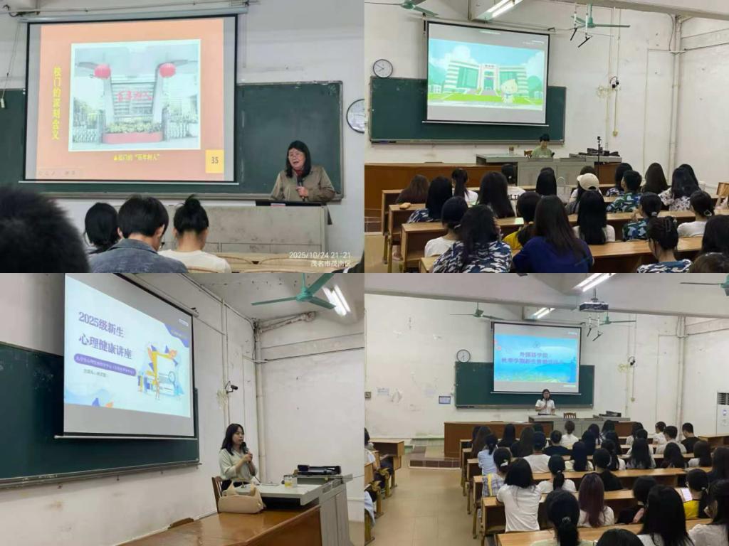 9月至10月,外国语学院持续开展新生入学教育系列讲座。为传承校史薪火,凝聚奋进力量,外国语学院特邀组织员陆慧芳主讲校史校情,借助珍贵历史照片与多媒体影像,再现学校发展脉络、办学特色与育人成就。学院团委副书记王美平全面解读九大资助板块,确保政策宣传“不漏一人”,资助帮扶“精准到位”。图书馆杨丽老师开展图书馆培训,帮助新生高效利用图书馆资源,提高学生信息素养与自主学习能力。大学生心理发展中心孙艾雯老师为外院学子开展心理健康教育讲座,助力新生实现从“被动适应”大学环境到“主动掌控”成长节奏的积极转变,为新生构建起坚实的心理支撑体系。