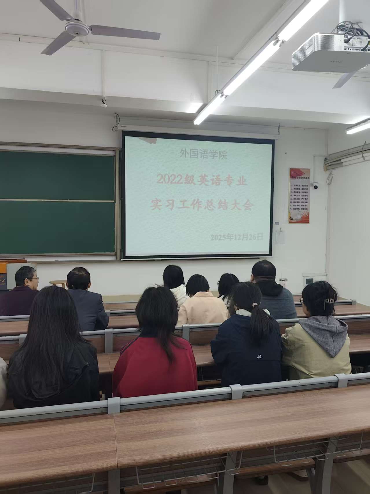 为了检验实习成果,总结实习经验,进一步提升师范专业人才培养成效,外国语学院于2025年12月26日上午在西城校区教学综合体J06教室召开了英语(师范)专业2022级学生教育实习总结大会。外国语学院院长李特夫、副院长高雷、实习指导教师秦毅、张金英、柯蓝、李思恒、余小玉、张晓玲、钟妮以及2022级英语专业实习生参加了会议。