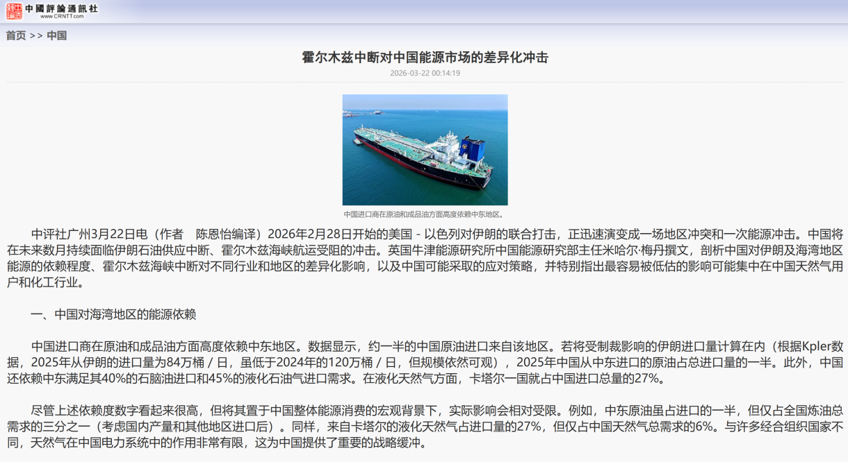 3月22日广东石油化工学院外国语学院学生、区域国别研究院科研助理陈恩怡在中国评论通讯社《中评电讯》栏目刊发题为《霍尔木兹中断对中国能源市场的差异化冲击》的编译文章,从中国对伊朗及海湾地区能源的依赖程度、霍尔木兹海峡中断对不同行业和地区的差异化影响,以及中国可能采取的应对策略等维度概述了英国牛津能源研究所中国能源研究部主任米哈尔·梅丹对霍尔木兹中断对中国能源市场的差异化冲击的深远影响剖析。