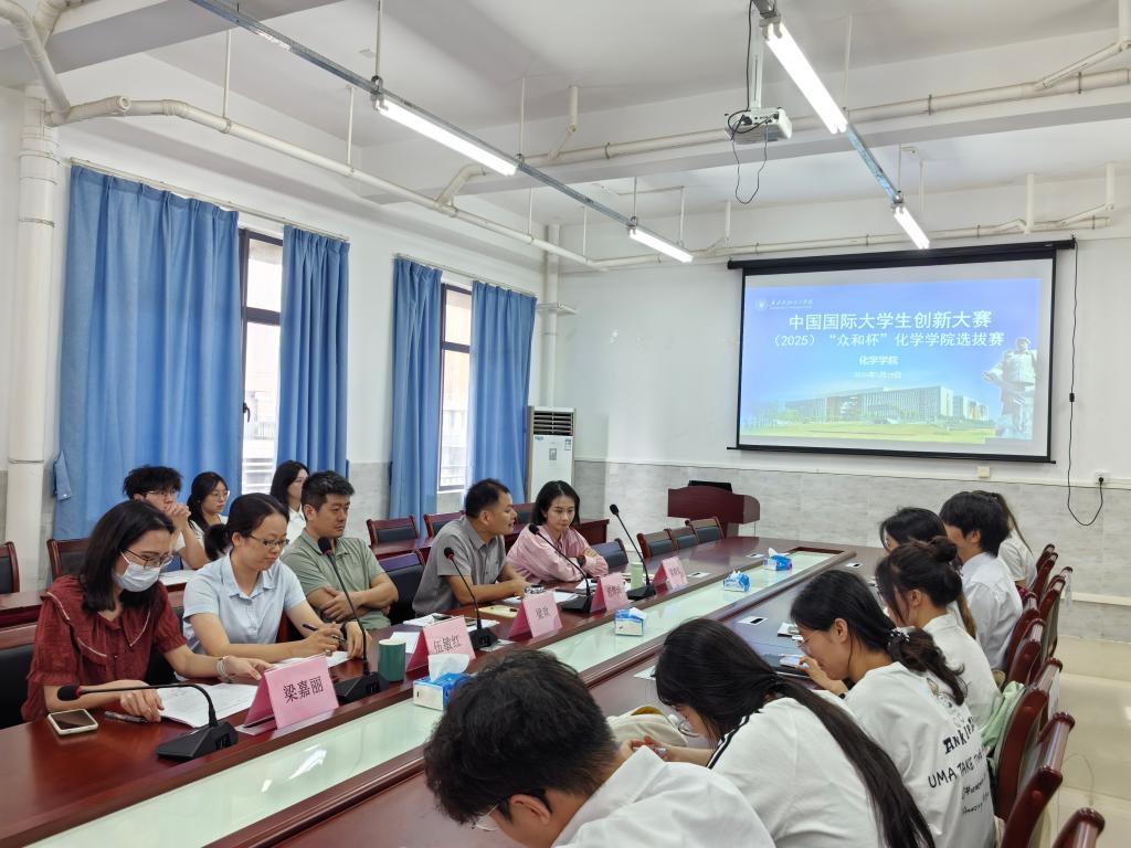 为激发大学生创新潜能,培育应用型人才核心素养,化学学院于5月29日上午在西城校区化学楼218会议室举办中国国际大学生创新大赛(2025)"众和杯"院级选拔赛。学院党委副书记梁欢、程辉成副教授、辅导员伍敏红、梁睿智、梁嘉丽担任评委,9支晋级团队参与激烈角逐。